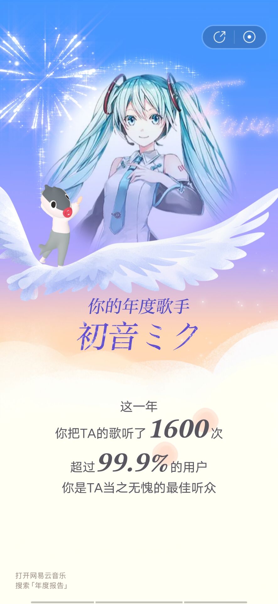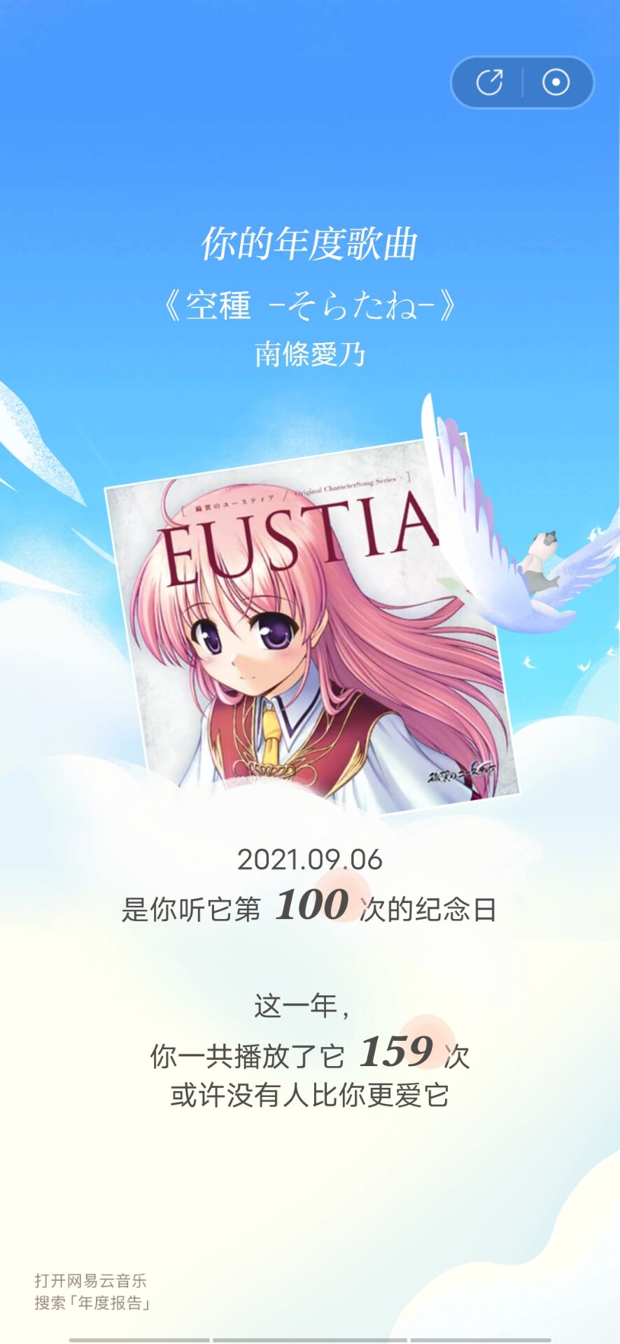其实我就是因为网易云音乐的年终总结才想起来可以写一个同主题博客的,所以第一个就贴里面总结的一些截图了。我非常惊讶的是我听初音的歌听了那么多次,居然打败了99%的人。年终歌曲空種そらたね是没有任何问题的,我直到现在还依然非常喜欢这首歌和Eustia,而且我是在2021年1月1日遇见这首歌的,所以,对于我来说,今年是Eustia和初音的一年。