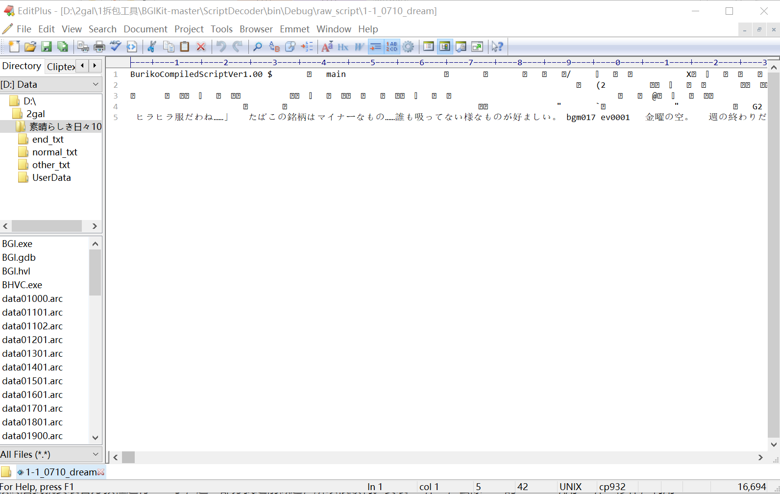 在游戏目录中arc的1开头的文件,正是游戏脚本文件,利用GARbro可以轻松提取出来,我尝试了很多编码,但无论用什么编码打开文本,浮现的始终是乱码。
